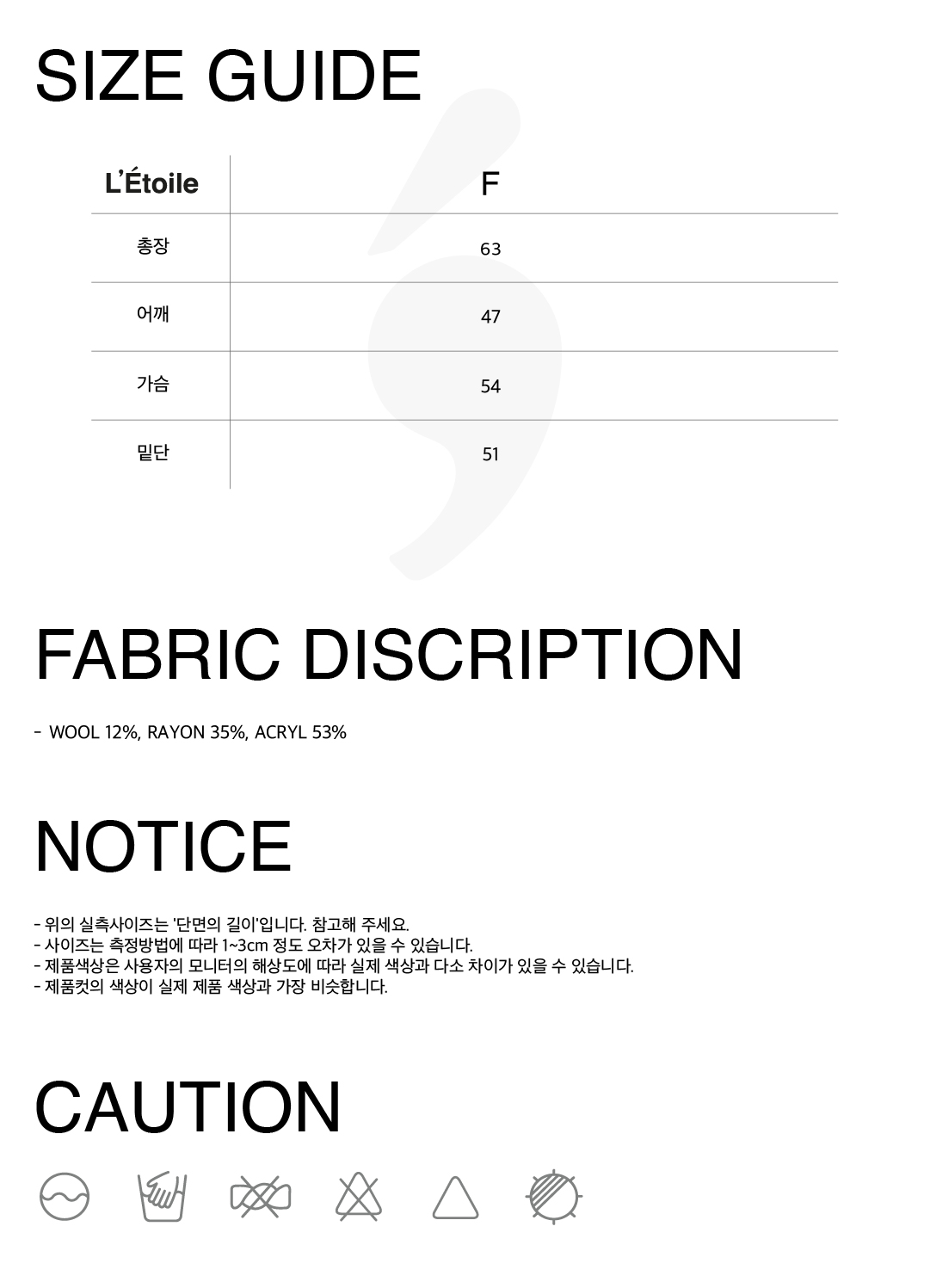 F 총장 63 어깨 47 가슴 54 소매 58 밑단 51